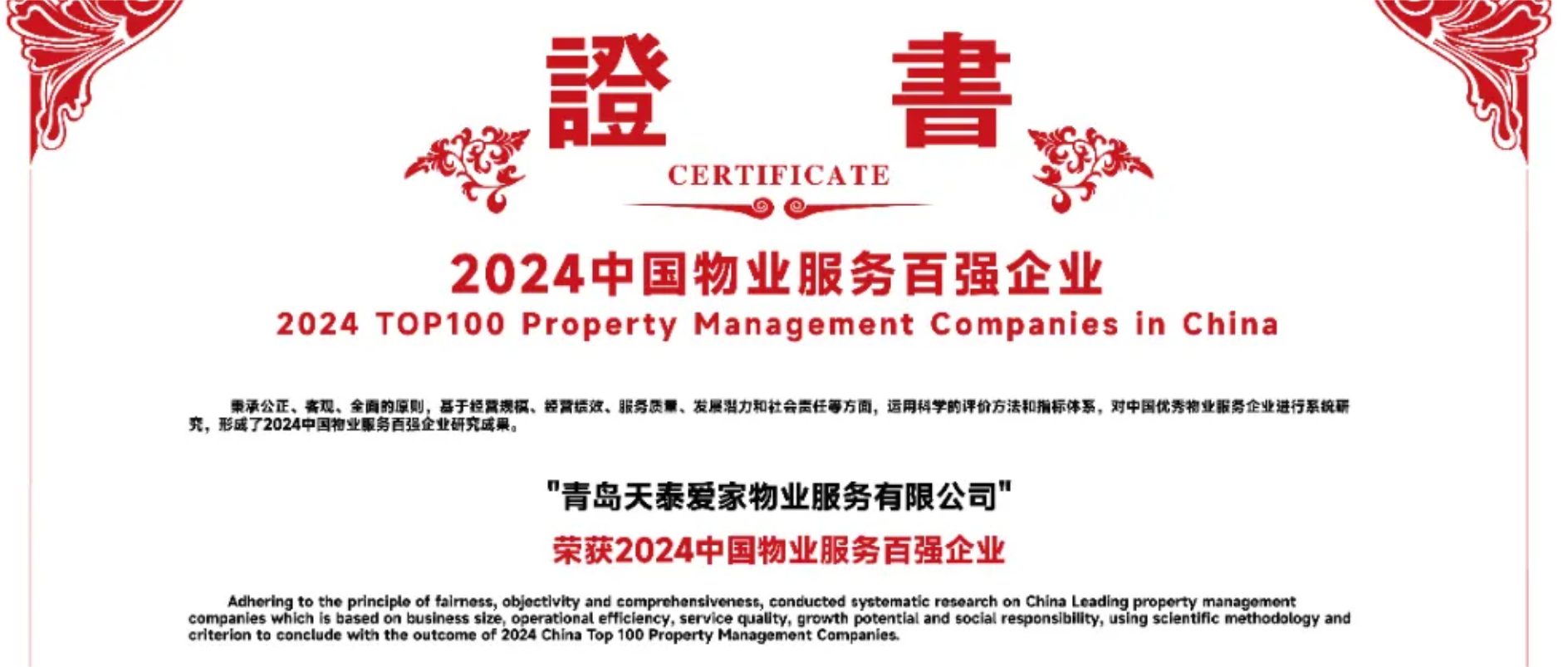 天泰服务凭借高品质、体系化、城市化的物业服务,荣获“2024中国物业服务百强企业”